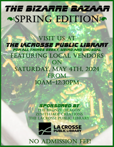 The Bizarre Bazaar Spring Edition is here - May 4th, 2024 from 10AM-12:30PM. This is a craft show for all things geeky, weird and unusual featuring local vendors. The Bazaar is sponsored by The Bronze Dragon, ZenithJade Creations, and the La Crosse Public Library. No admission fee.