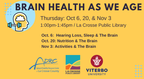 Join the ADRC, Viterbo Nursing students and the La Crosse Public Library for tips on maintaining brain health as we age.  At each session we'll share information and proactive steps you can take to encourage a brain-healthy lifestyle!  Education and strategies on additional aspects of brain health will be discussed and library resources for incorporating them into your life will be provided.