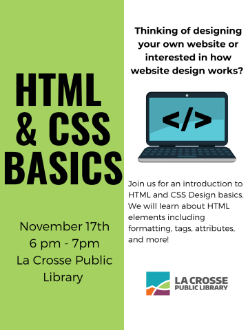Thinking of designing your own website or interested in how website design works? Join us for an introduction to HTML and CSS Design basics. We will learn about HTML elements including formatting, tags, attributes, and more!