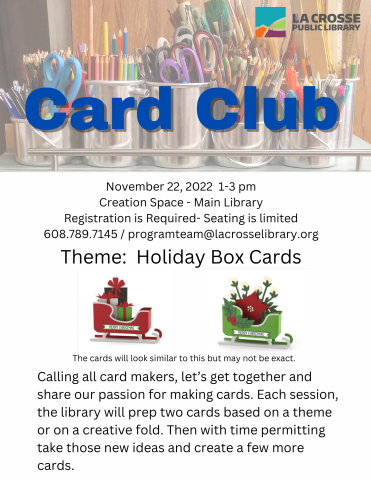 Calling all card makers, let’s get together and share our passion for making cards. Each session, the library will prep two cards based on a theme or on a creative fold. Then with time permitting take those new ideas and create a few more cards. Registeration is required