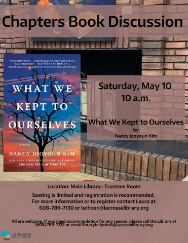 Chapters is the La Crosse Public library's monthly book discussion group featuring popular fiction covering a variety of genres. Our discussions are wonderful opportunities to connect with fellow book lovers to discuss a new title each month in a relaxed and fun environment.
