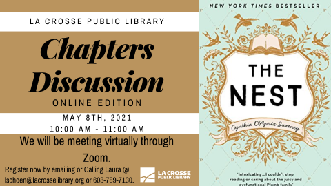 Join us Saturday, May 8th at 10:00 a.m. to discuss The Nest by Cynthia D'Aprix Sweeney. We'll be meeting via Zoom and registration is required.