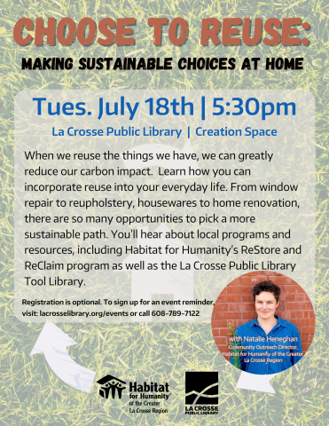 When we reuse the things we have, we can greatly reduce our carbon impact. Learn how you can incorporate reuse into your everyday life. From window repair to reupholstery, housewares to home renovation, there are so many opportunities to pick a more sustainable path. You’ll hear about local programs and resources, including Habitat for Humanity’s ReStore and ReClaim program as well as the La Crosse Public Library Tool Library. Registration is optional.