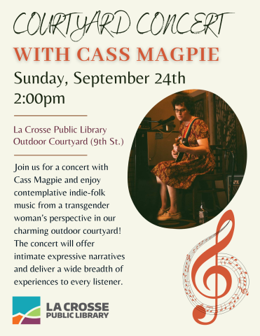 Join us for a concert with Cass Magpie and enjoy contemplative indie-folk music from a transgender woman’s perspective in our charming outdoor courtyard. The concert will offer intimate expressive narratives and deliver a wide breadth of experiences to every listener.