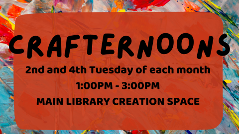 Join us on the 2nd and 4th Tuesday of the Month starting February 22nd from 1-3 pm for crafts and camaraderie! This will be held in our Creation Space where you can use our craft supplies to make your next masterpiece or bring in your own work in progress. At times the Library will offer a small project to get your creative juices going.