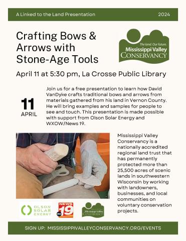 This presentation is part of Mississippi Valley Conservancy's Linked to the Land educational series. For additional information, please see: https://mississippivalleyconservancy.org/events/crafting-bows-arrows-stone-age-tools
