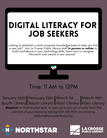 Using Northstar Digital Literacy, we will use interactive online modules to learn the basics of computers, Microsoft Word, Microsoft Excel, and how to build a strong resume. Use the modules alone to test your knowledge or earn certificates when assessments are passed and proctored through the La Crosse Public Library, either virtually or in person.