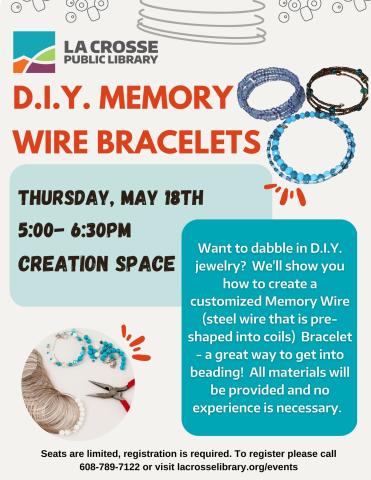 Want to dabble in D.I.Y. jewelry? We will show you how to create a customized Memory Wire (a steel-based wire that is pre-shaped into coils) Bracelet - a great way to get into beading! All materials will be provided and no experience is necessary.