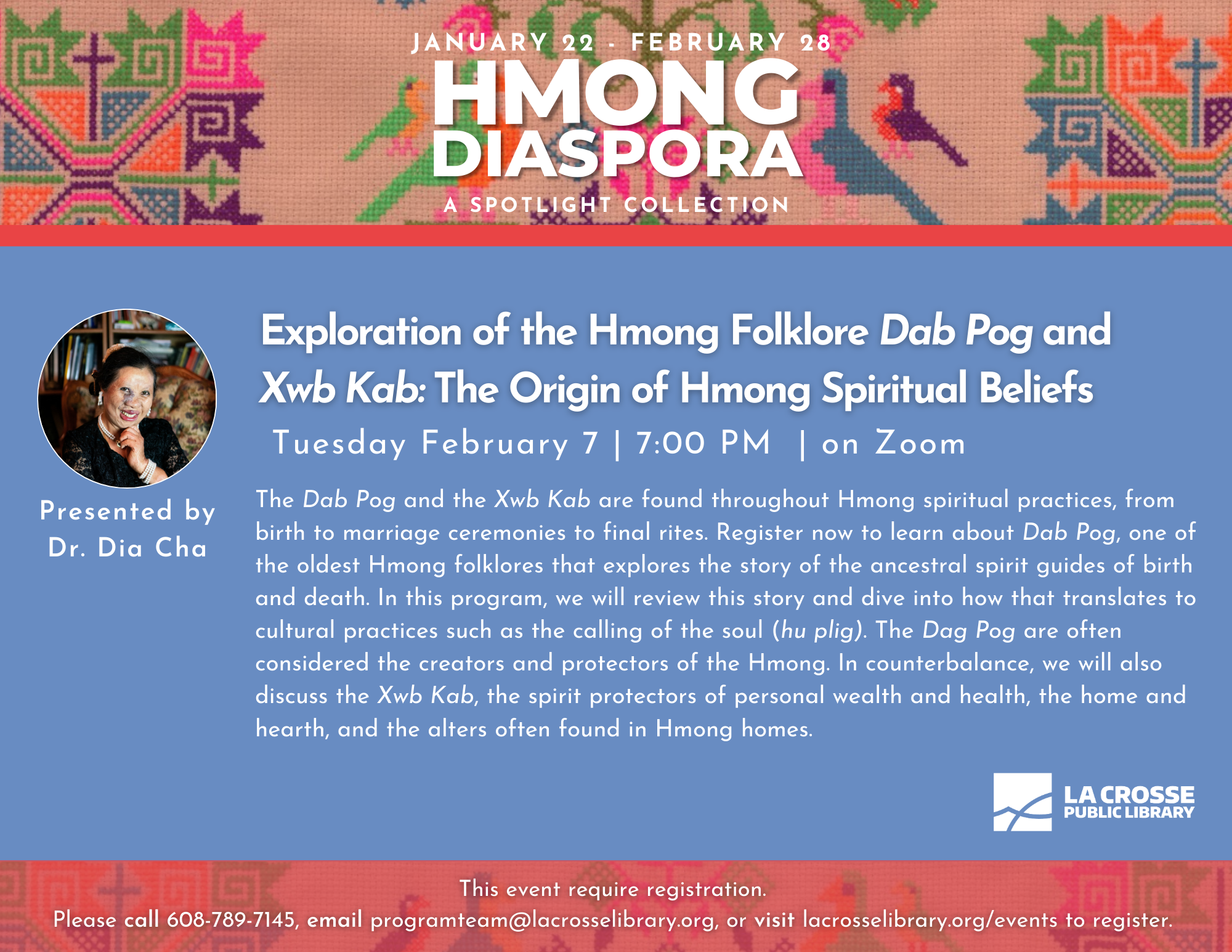The Dab Pog and the Xwb Kab are found throughout Hmong spiritual practices, from birth to marriage ceremonies to final rites. Register now to learn about Dab Pog, one of the oldest Hmong folklores that explores the story of the ancestral spirit guides of birth and death. In this program, we will review this story and dive into how that translates to cultural practices such as the calling of the hu plig (soul). The Dag Pog are often considered the creators and protectors of the Hmong. In counterbalance, we will also discuss the Xwb Kab, the spirit protectors of personal wealth and health, the home and hearth, and the alters often found in Hmong homes.