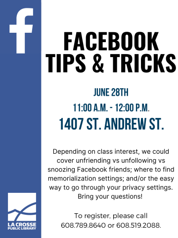 Depending on class interest, we could cover unfriending vs unfollowing vs snoozing Facebook friends; where to find memorialization settings; and/or the easy way to go through your privacy settings. Bring your questions!