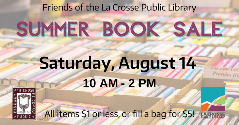 Need to stock up on reading materials? Stop by the Friends of the La Crosse Public Library book sale - a great way to support our fundraising efforts while getting some new books! We'll have tables and carts of materials arranged by genre and material type in our newly refurbished Main Hall space. Sale items will be priced at $1.00 for hardback books; $.50 for DVDs and audiobooks; and $.25 for paperbacks or stock up and fill a bag for $5.00. Please enter via the 9th Street doors and if possible, please bring exact change. With guidance from La Crosse County Health, mask use is strongly recommended inside the library for both vaccinated and unvaccinated people. Thanks for your support!