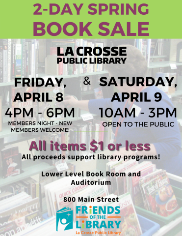 Friends of the La Crosse Public Library are invited to enjoy advance shopping hours on the opening day of our 2-day Spring Book Sale. You can join or renew your membership at the door and new members are always welcome. Membership dues start at $10.00!