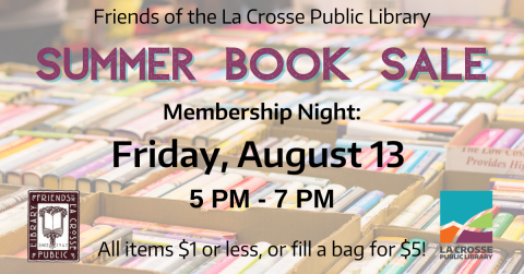 Friends of the La Crosse Public Library are invited to enjoy advance shopping hours on the opening day of our 2-day Summer Book Sale. You can join or renew your membership at the door and new members are always welcome. You can renew your membership at the door and new members are welcome to join. Membership dues start at $10.00!