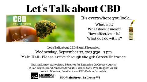 Join us for a panel discussion featuring Dillon Beyer, Brand Ambassador and & CBD consultant, Tree Hugger’s Co-op; Austin Wszolek, President & CEO of Carbon Cannabis, and Kaitlyn Davis, Agriculture Educator for Extension of La Crosse County as we explore these questions and more.