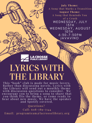 This “book” club is made for music lovers. Rather than discussing novels, Lyrics with the Library will send out a monthly theme with discussion questions to consider. We encourage you to bring a song to share that you think fits the theme, or come ready to hear about new music. We have the speaker and Spotify covered.