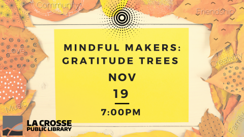 - Stop by the La Crosse Public Library between Nov 9-19 during open hours (Monday-Tuesday & Thursday-Friday: 10am-6pm; Saturday 1pm-5pm) to pick up your craft kit