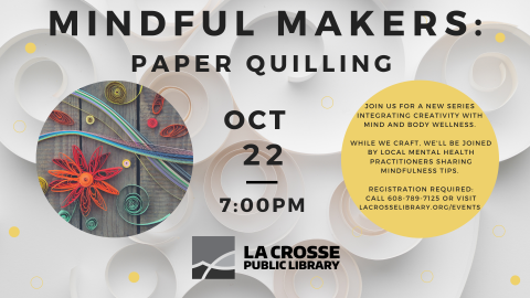 During this session, we’ll learn techniques for paper quilling. While our hands are busy creating, we’ll open up our minds as we're joined by local community health professionals who will share tips on maintaining mindfulness. Craft supplies will be provided and registration is required to participate in this online program.