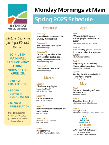 Welcome back to Monday Mornings at Main - our signature lifelong learning program series for ages 50 and better!  Each Monday morning at 10:00AM, we'll hear from a new speaker on a variety of topics ranging from local history, health and wellness, to popular entertainment and more!  Registration is not necessary.