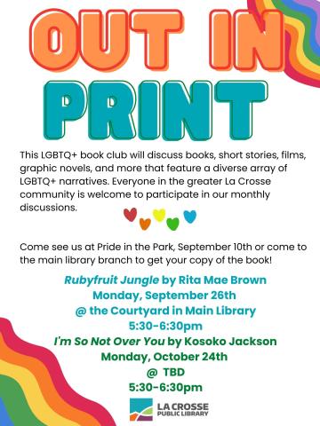 This LGBTQ+ book club will discuss books, short stories, films, graphic novels, and more that feature a diverse array of LGBTQ+ narratives. Everyone in the greater La Crosse community is welcomed to participate in our monthly discussions.