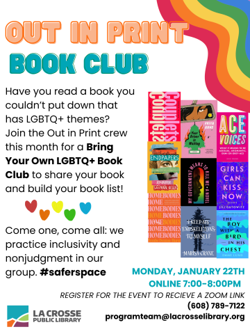 Have you read a book you couldn't put down that has LGBTQ+ themes? Join the Out in Print crew this month for a Bring Your Own LGBTQ+ Book Club online this month online from 7:00-8:00pm to share your book and build your book list!