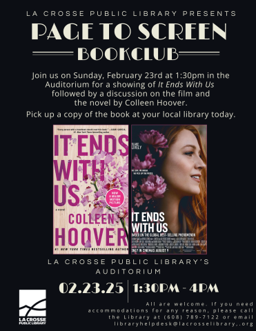 Join us on Sunday, February 23rd at 1:30pm in the Auditorium for a showing of It Ends With Us followed by a discussion on the film and the novel by Colleen Hoover.