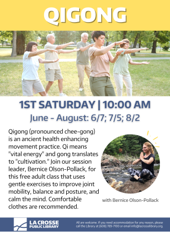 Qigong (pronounced chee-gong) is an ancient health enhancing movement practice. Qi means "vital energy" and gong translates to "cultivation." Join our session leader, Bernice Olson-Pollack, for this free adult class that uses gentle exercises to improve joint mobility, balance and posture, and calm the mind. Comfortable clothes are recommended.