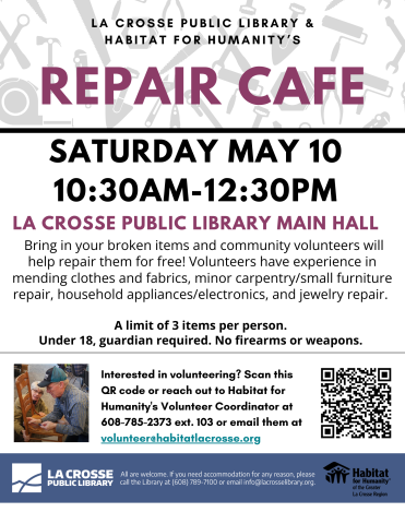 Join us with Habitat for Humanity for our Repair Cafe! Bring in your broken items and our volunteers will teach you about minor repairs and will help repair them for free. Volunteers have experience in mending clothes and fabrics, minor carpentry/small furniture repair, household appliances/electronics, and jewelry repair.