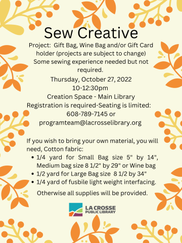 Project: Gift Bag, Wine Bag and/or Gift Card holder (projects are subject to change) Some sewing experience needed but not required.