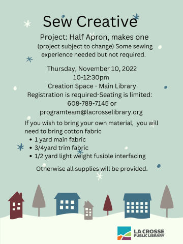Project: Half Apron, makes one (project subject to change) Some sewing experience needed but not required.