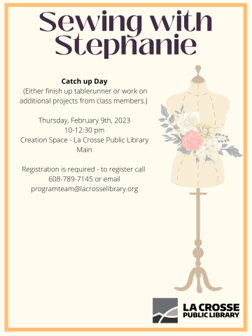 Catch up Day (Either finish up tablerunner or work on additional projects from class members.) Thursday, February 9th, 2023 10-12:30 pm Creation Space - La Crosse Public Library Main Registration is required - to register call 608-789-7145 or email programteam@lacrosselibrary.org
