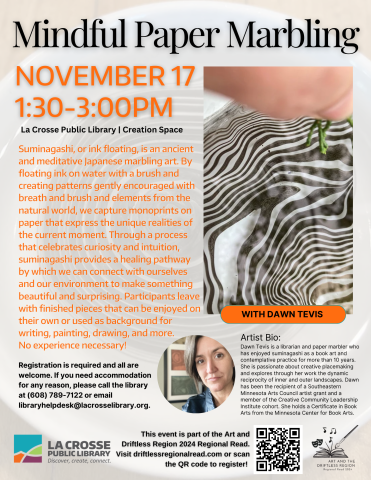 Dawn Tevis is a librarian and paper marbler who has enjoyed suminagashi as a book art and contemplative practice for more than 10 years. She is passionate about creative placemaking and explores through her work the dynamic reciprocity of inner and outer landscapes. Dawn has been the recipient of a Southeastern Minnesota Arts Council artist grant and a member of the Creative Community Leadership Institute cohort. She holds a Certificate in Book Arts from the Minnesota Center for Book Arts.