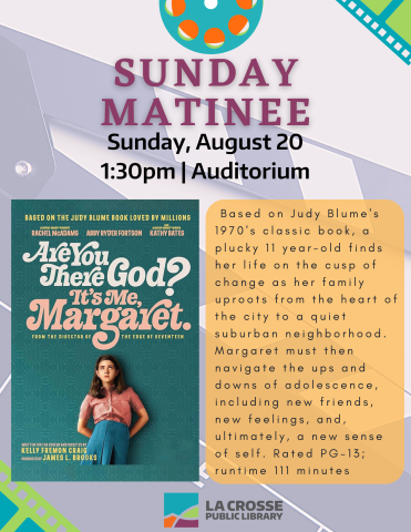 Join us for a screening of "Are You There God? It's Me, Margaret." Based on Judy Blume's 1970's classic book, a plucky eleven-year-old named Margaret finds her life on the cusp of change as her family uproots from the heart of the city to a quiet suburban neighborhood. Margaret must then navigate the ups and downs of adolescence, including new friends, new feelings, and, ultimately, a new sense of self. Rated PG-13; runtime 111 minutes