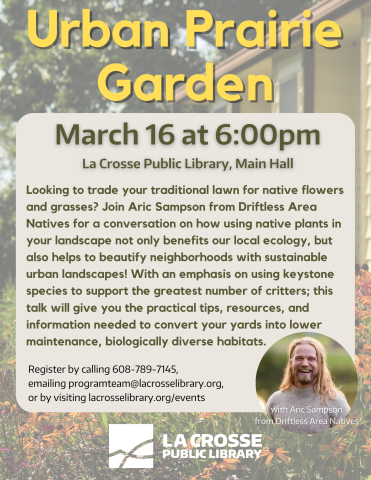 Looking to trade your traditional lawn for native flowers and grasses? Join Aric Sampson from Driftless Area Natives for a conversation on how using native plants in your landscape not only benefits our local ecology, but also helps to beautify neighborhoods with sustainable urban landscapes! With an emphasis on using keystone species to support the greatest number of critters; this talk will give you the practical tips, resources, and information needed to convert your yards into lower maintenance, biologically diverse habitats.