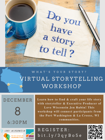 In this free virtual workshop, you will learn from experienced storyteller, Jen Rubin, and connect with people from the La Crosse and Port Washington communities with stories to share. Presented by Wisconsin Humanities in partnership with the La Crosse Public Library and the W. J. Niederkorn Library.
