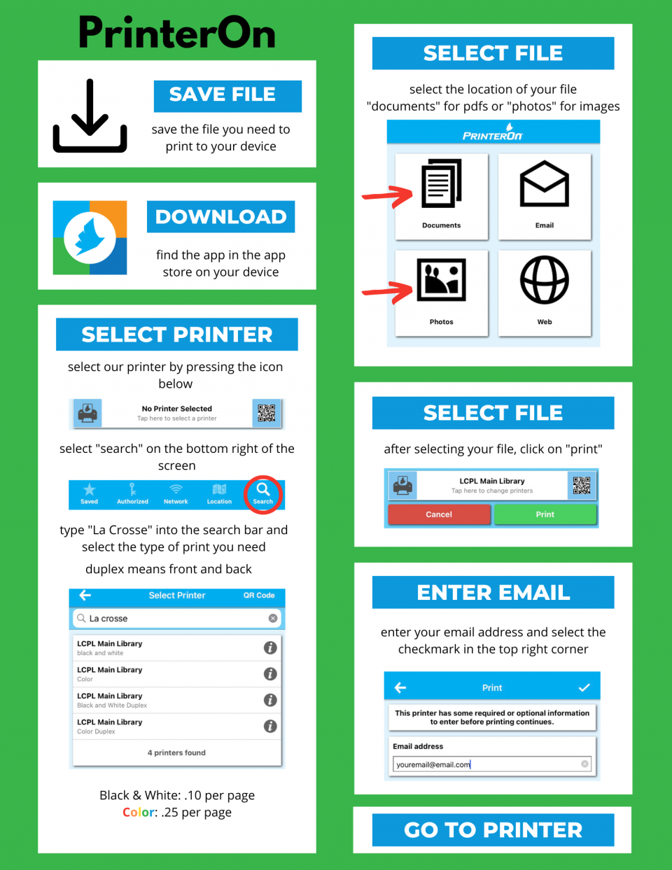 You can print wirelessly via Princh from your laptop, tablet or smartphone to the library's printer at the Main library on the 2nd floor by following the steps below.